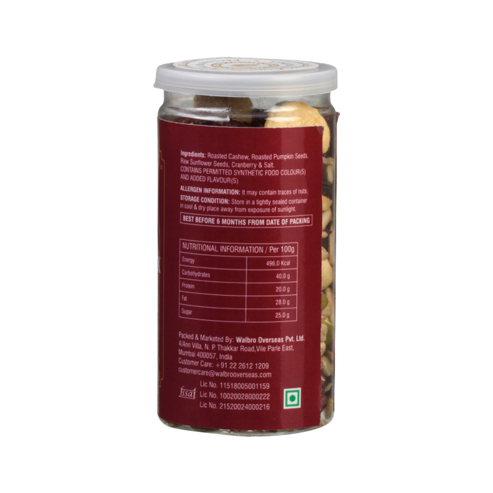 Roasted Cashew, Roasted Pumpkin Seeds, Raw Sunflower Seeds, Cranberry & Salt.